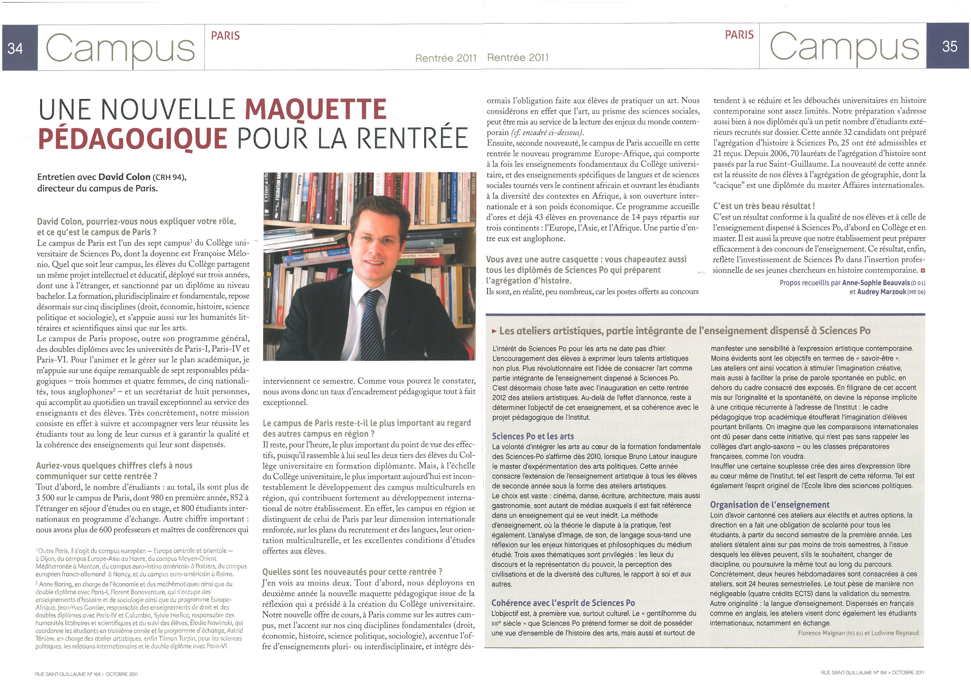 - « Campus de Paris : la nouvelle maquette pédagogique pour la rentrée », Entretien publié dans Rue Saint-Guillaume. Revue de l’association des Sciences Po, n°164, septembre-octobre 2011.
