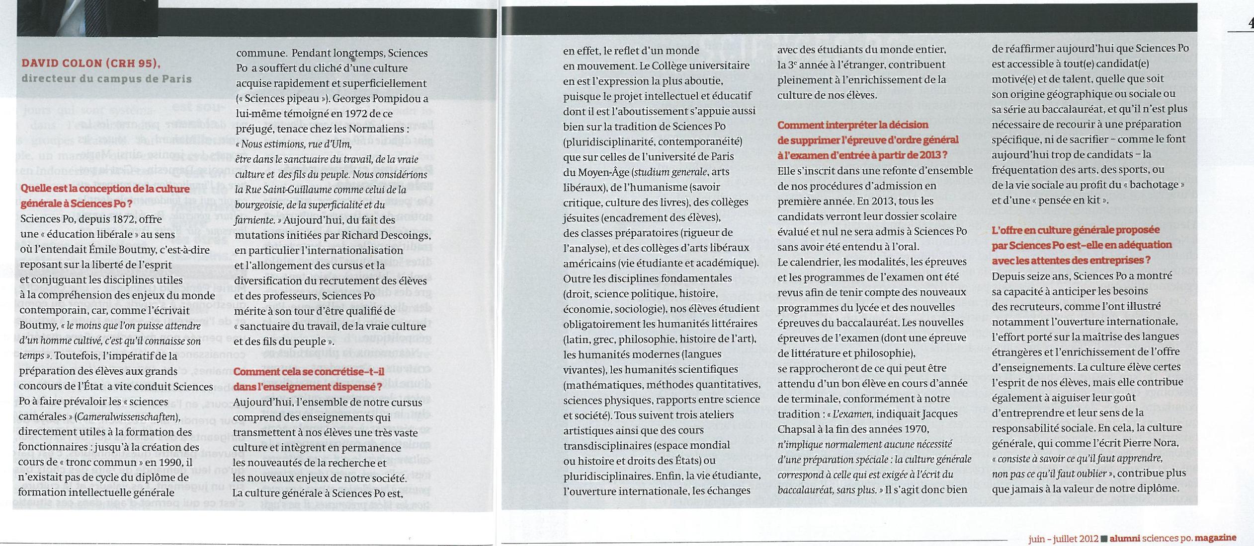 - « La culture générale à Sciences Po », Entretien publié dans Alumni Sciences Po Magazine, n°1, juin-juillet 2012.